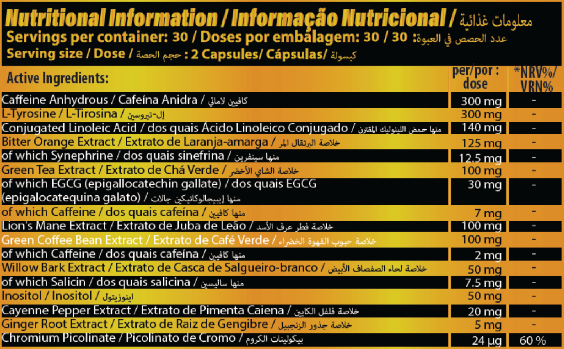 Cafeína anidra, L-Tirosina, cápsula vegetal (hipromelose), ácido linoleico conjugado em pó (a partir do óleo de cártamo), Laranja amarga (Citrus aurantium L.) extrato 15:1 do fruto, Chá verde (Camellia sinensis) extrato ¾:1 das folhas, Juba-de-leão (Hericium erinaceus) extrato do esporóforo, Café verde (Coffea robusta L.) extrato 12:1 da semente, Casca de salgueiro (Salix alba L.) extrato 8:1, Inositol, Pimenta caiena (Capsicum annuum Linne) extrato 8:1 do fruto, Gengibre (Zingiber officinale) extrato 20:1 da raiz, Picolinato de crómio.