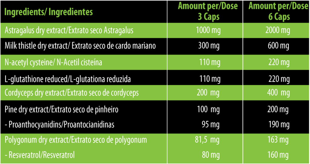 Extrato seco de astrágalo (Astragalus membranaceus, raiz), Extrato seco de cardo leitoso (Silybum marianum (L.) Gaertn., semente) 80% silimarina e 30% silibina, Agente de volume: celulose microcristalina (E-460i), Extrato seco de cordyceps (Cordyceps sinensis, micélio), N-acetil cisteína, L-glutationa reduzida, Extrato seco de pinheiro (Pinus pinaster, casca) 95% proantocianidinas, Extrato seco de polygonum (Polygonum cuspidatum, raiz) 98% resveratrol e agente antiaglomerante: sais de magnésio de ácidos gordos (E-470b), Cápsula (agente de revestimento: hidroxipropil metilcelulose (E-464)).