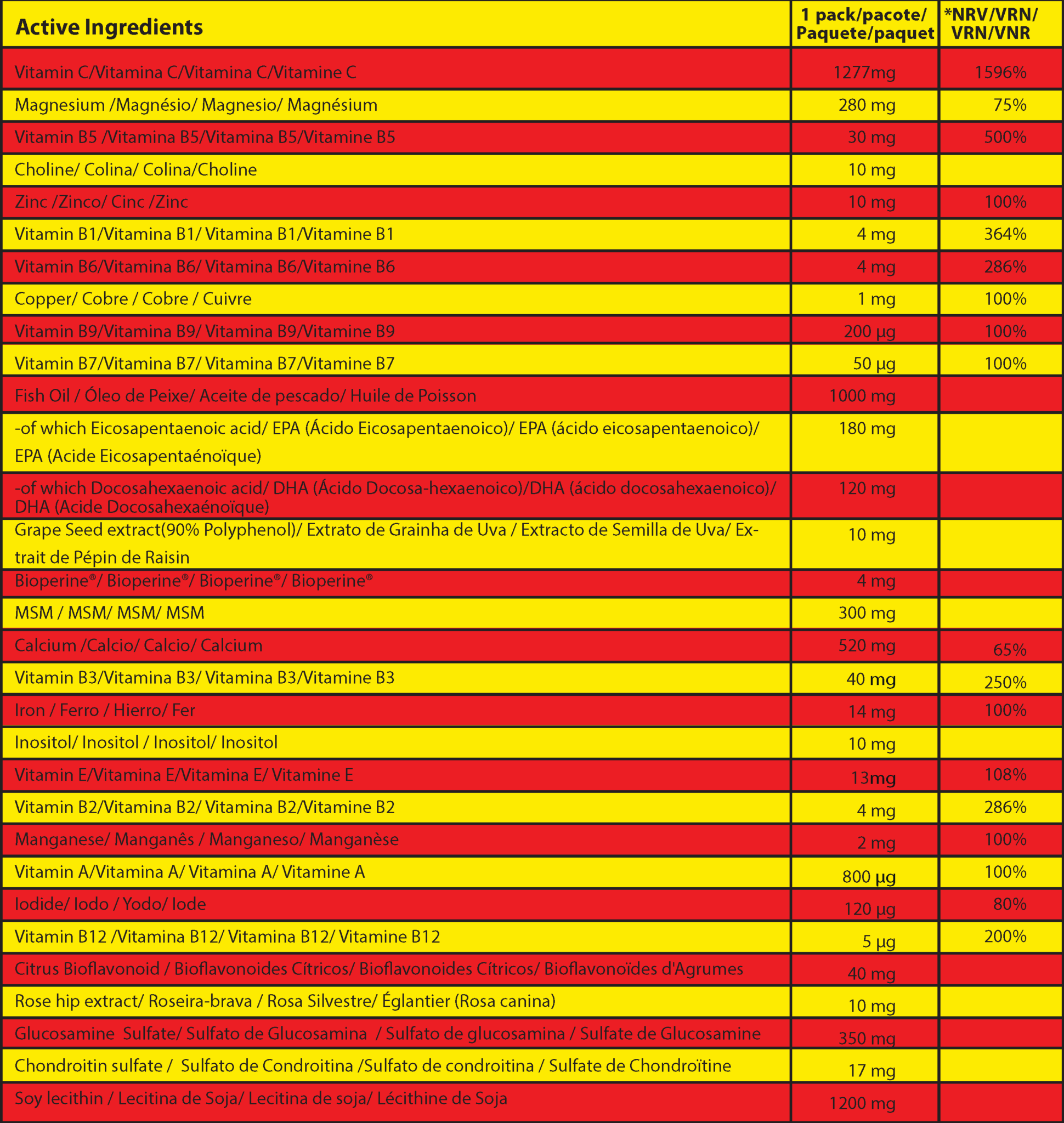 2 cápsulas multivitamínicas: Agente de volume (celulose microcristalina), carbonato de cálcio, ácido L-ascórbico, gelatina bovina (como invólucro da cápsula), óxido de magnésio, betacaroteno, sulfato de ferro (II), nicotinamida, acetato de DL-alfa-tocoferol, pantotenato de cálcio D, bitartarato de colina, iodeto de potássio, óxido de zinco, inositol, sulfato de manganês (II), cianocobalamina,D-biotina, cloridrato de piridoxina, cor (óxido de ferro), tiamina monohidratada, riboflavina, sulfato de cobre (II), folato.Cápsula de gelatina de óleo de PEIXE: óleo de PEIXE, Humidicante (gelatina, glicerina, água purificada), antioxidante (DL--tocoferol).Cápsula do complexo C: ácido L-ascórbico, gelatina bovina (como invólucro da cápsula), complexo de bioflavonóides cítricos, extrato de rosa mosqueta (fruta) 20:1, extrato de Vitis vinifera (semente) 120:1, corante (óxido de ferro), Bioperine® (Extrato de Piper nigrum (fruta)50:1) [Bioperine® é uma marca registrada licenciada da Sabinsa Europe GmbH].Comprimido CA-MG: Carbonato de Cálcio, Óxido de Magnésio, Agente de Volume, (Celulose Microcristalina), Agente Antiaglomerante (Estearato de Magnésio).Cápsula complexa de articulações: Sulfato de D-Glucosamina 2KCL, Metilsulfonilmetano (MSM), Gelatina Bovina (como invólucro da cápsula), Ácido Ascórbico L, Sulfato de Condroitina, Acetato de DL-Alpha Tocopheryl, Corante (Óxido de Ferro).Cápsula de gelatina mole de lecitina de SOJA: lecitina de SOJA(71%), Humidicante (gelatina, glicerina, água purificada).