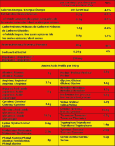 Isolado de proteína de soro de leite microfiltrado de fluxo cruzado (do leite, instantâneo com lecitina de girassol), Cacau Magro em Pó , sabor (sabor a chocolate), Cloreto de sódio, Espessante (goma xantana), Edulcorantes (acessulfame K, sucralose), Complexo enzimático Digezyme® (alfa-amilase, protease neutra, celulase, lactase, lipase).