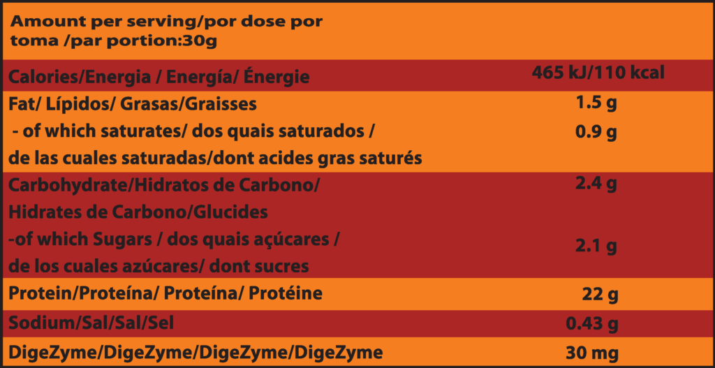 Concentrado de proteína do soro de Leite [do leite (emulsionante: lecitina de girassol)], aromatizantes sal, cacau em pó magro, espessante (goma xantana), edulcorantes (acesulfame K, sucralose), complexo enzimático Digezyme® (alfa-amilase, protease neutra,celulase, lactase, lipase).