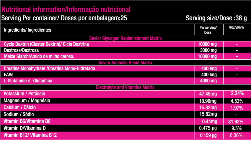 Ciclo dextrina, Amido de milho ceroso Sulfitos, Creatina Mono-Hidratada, L-Glutamina, EAAs (L-Leucina, L-Lisina, L-Fenilalanina, L-Valina, L-Treonina, L-Isoleucina, L-Metionina, L-Histidina, L-Triptofano), Dextrosa, Sabor, Agente anticaking (dióxido de silício), Regulador da acidez (ácido cítrico), Corante (Beterraba), Edulcorante (sucralose E955), Cloreto de potássio, Óxido de magnésio, Carbonato de cálcio, Cloreto de sódio, Vitaminas: Cloridrato de piridoxina (vitamina B6), Colecalciferol (vitamina D), Cianocobalamina (Vitamina B12).